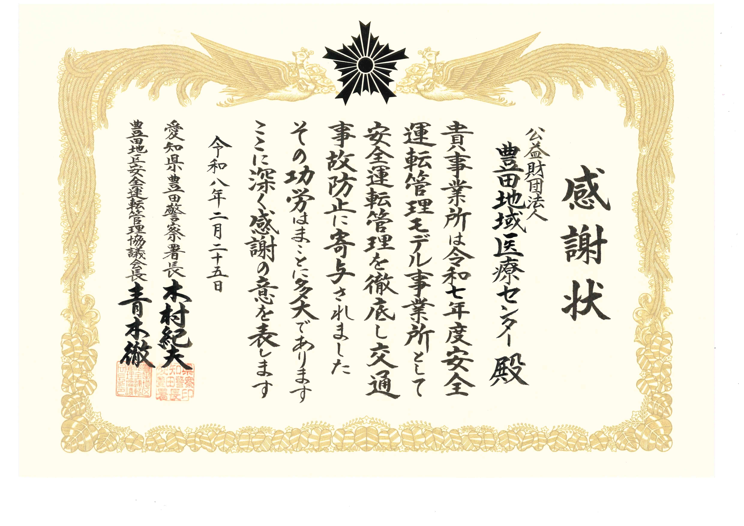 愛知県豊田警察署長および豊田地区安全運転管理協議会長の連名による感謝状をいただきました。