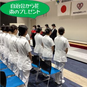 来賓の方々からの温かいお祝いの言葉や、実習病院からのお花の贈り物、そして最後には自治会からのお花のプレゼントも🌸